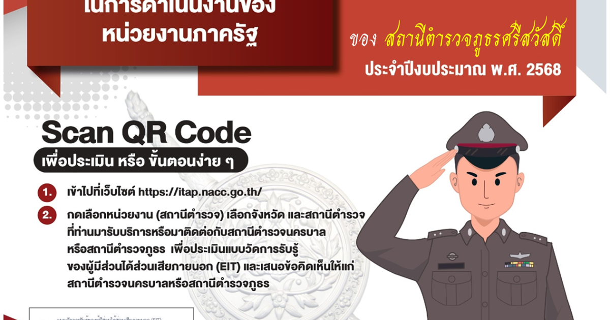 ขอเชิญผู้มารับบริการหรือมาติดต่อราชการร่วมประเมินคุณธรรมและความโปร่งใสในการดำเนินงานของหน่วยงานภาครัฐ ของสถานีตำรวจภูธรศรีสวัสดิ์ ประจำปีงบประมาณ พ.ศ. 2568