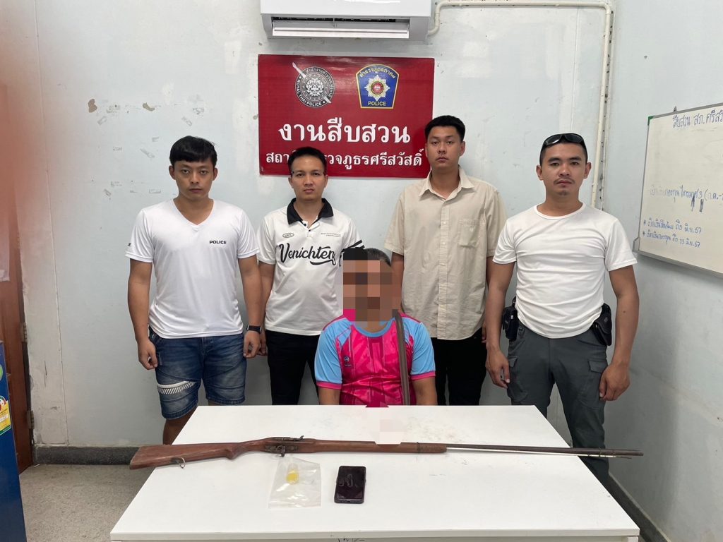 📍ของกลาง 1. อาวุธปืนแก๊ปยาว (แบบไทยประดิษฐ์) ชนิดบรรจุปากกระบอก ไม่มีเครื่องหมายทะเบียน จำนวน 1 กระบอก