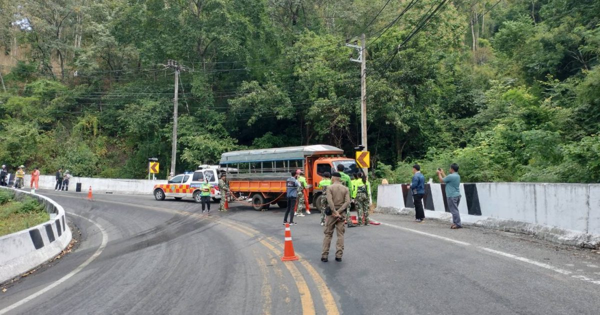 ร่วมกันซ้อมแผนอุบัติเหตุ ณ ถนนทางขึ้นเขาตับเต่า ต.ท่ากระดาน อำเภอศรีสวัสดิ์ จังหวัดกาญจนบุรี