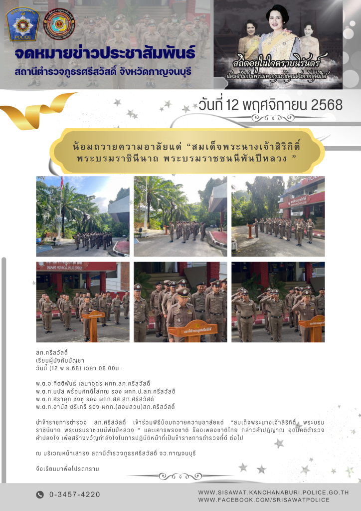นำข้าราชการตำรวจ สภ.ศรีสวัสดิ์ เข้าร่วมพิธีน้อมถวายความอาลัยแด่ “สมเด็จพระนางเจ้าสิริกิติ์ พระบรมราชินีนาถ พระบรมราชชนนีพันปีหลวง ” และเคารพธงชาติ ร้องเพลงชาติไทย กล่าวคำปฏิญาณ อุดมคติตำรวจ คำปลงใจ เพื่อสร้างขวัญกำลังใจในการปฏิบัติหน้าที่เป็นข้าราชการตำรวจที่ดี ต่อไป