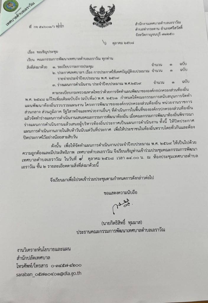 ประชุมคณะกรรมการพัฒนาเทศบาลตำบลเอราวัณ ครั้งที่ 1/2569 ( 9 ตุลาคม 2568 ) เวลา 14.00 น.
