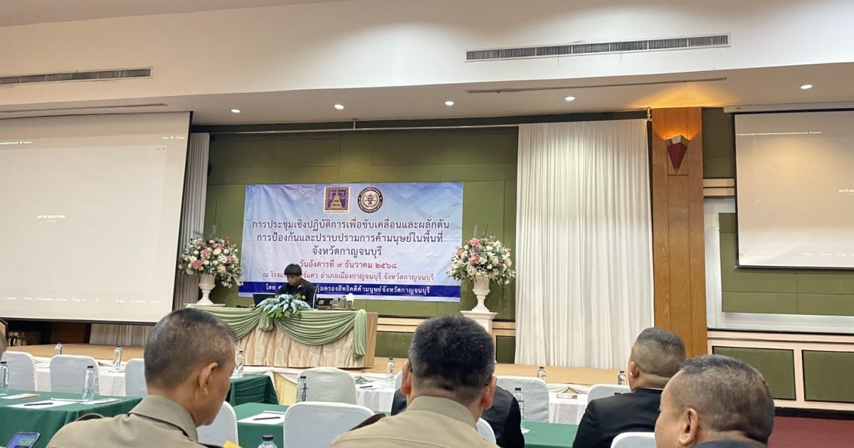 ประชุมเชิงปฏิบัติการเพื่อขับเคลื่อนและพลักดันการป้องกันและปราบปรามการค้ามนุษย์ในพื้นที่จังหวัดกาญจนบุรี ณ โรงแรมริเวอร์แคว ( 9 ธันวาคม 2568 ) เวลา 09.00 น.