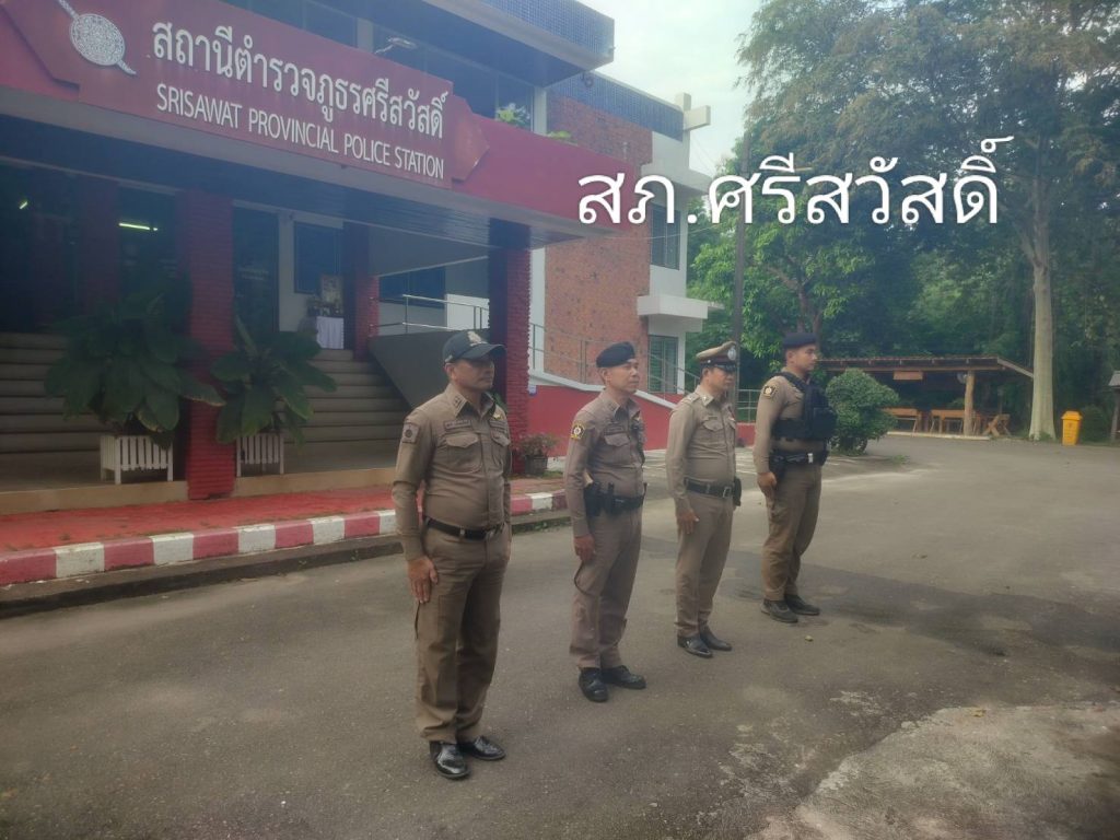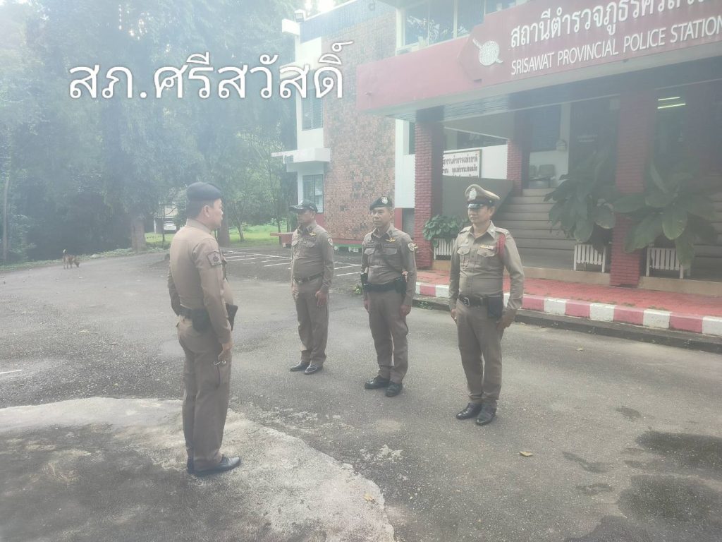 เวลา 08.00 น. พ.ต.ท.มนัส พร้อมศักดิ์โสภณ รอง ผกก.ป.สภ.ศรีสวัสดิ์,พ.ต.ต.สุที มูลทรงเกียรติ์ สวป.สภ.ศรีสวัสดิ์,ร.ต.อ.ศักดิ์ชัย ลู่เลิศกิจ รอง.สวป.สภ.ศรีสวัสดิ์