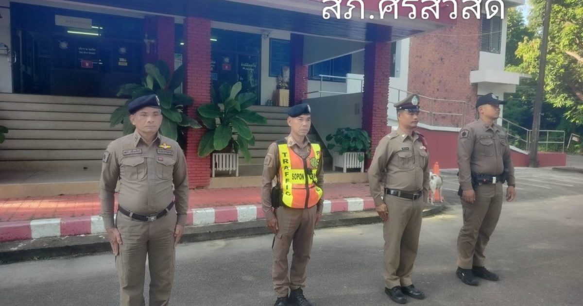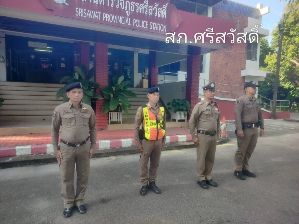 เวลา 08.00 น. พ.ต.ท.มนัส พร้อมศักดิ์โสภณ รอง ผกก.ป.สภ.ศรีสวัสดิ์,พ.ต.ต.สุที มูลทรงเกียรติ์ สวป.สภ.ศรีสวัสดิ์,ร.ต.อ.ศักดิ์ชัย ลู่เลิศกิจ รอง.สวป.สภ.ศรีสวัสดิ์