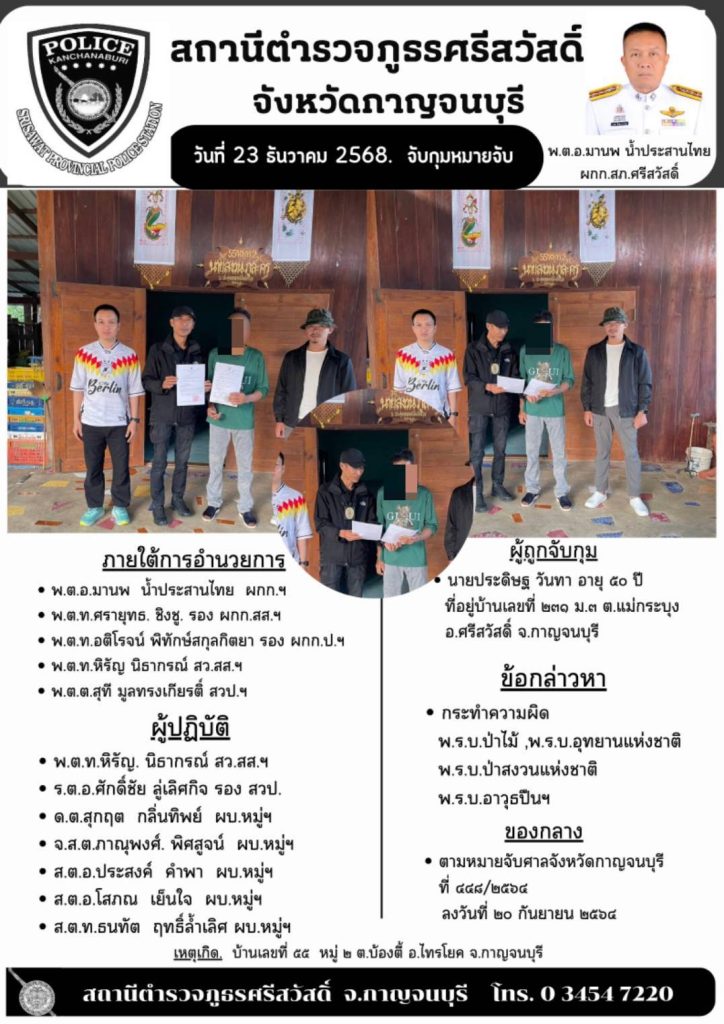 📍สถานที่จับกุม บ้านเลขที่ ๕๕ หมู่ ๒ ต.บ้องตี้ อ.ไทรโยค จ.กาญจนบุรี เมื่อวันที่ ๒๓ ธันวาคม ๒๕๖๘ เวลาประมาณ ๐๗.๒๐ น.