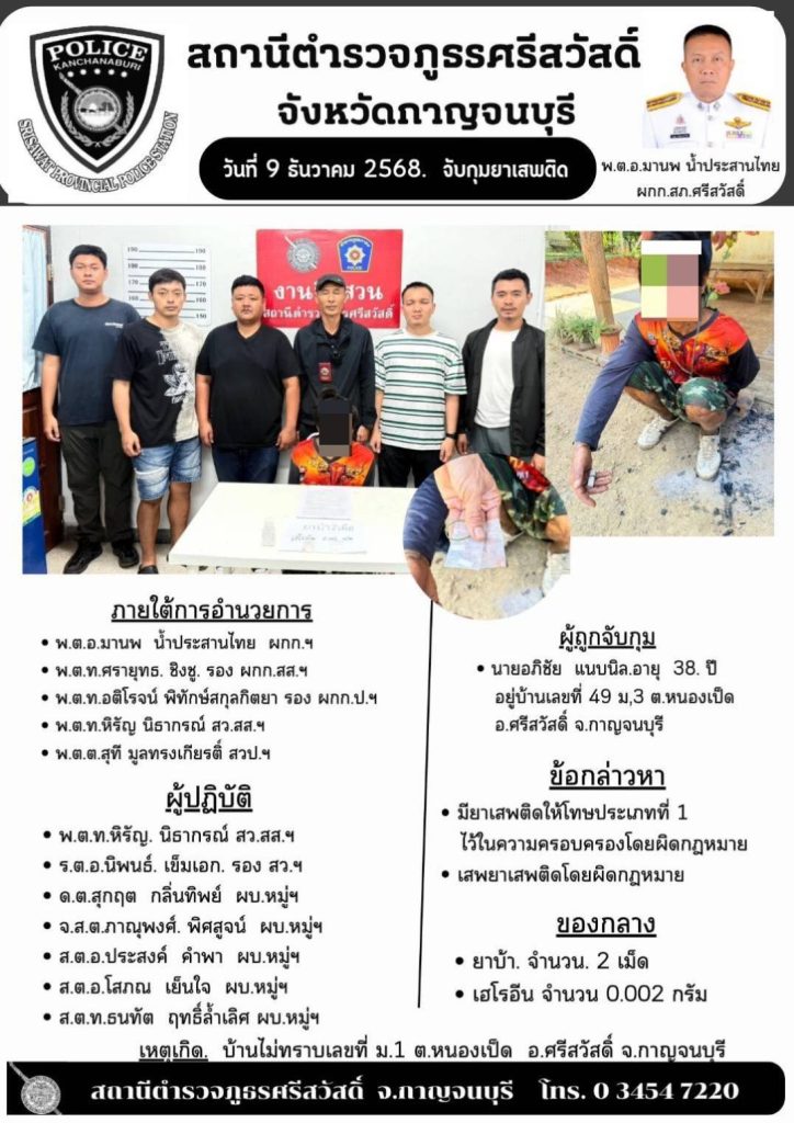 📍สถานที่จับกุม บ้านพักไม่มีเลขที่ หมู่ ๒ ต.ท่ากระดาน อ.ศรีสวัสดิ์ จว.กาญจนบุรี เวลาประมาณ ๑๓.๒๐ น.