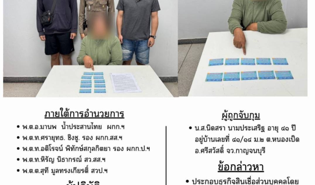 ๑.นางสาวนิดสรา นามประเสริฐ อายุ ๔๑ ปี ที่อยู่ตามทะเบียนราษฎร์ บ้านเลขที่ ๔๑/๑๔ ม.๒ ต.หนองเป็ด อ.ศรีสวัสดิ์ จว.กาญจนบุรี ผู้ต้องหา