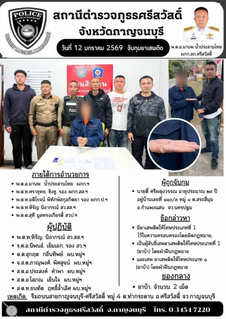 📍สถานที่จับกุม ริมถนนสายกาญจนบุรี-ศรีสวัสดิ์ บริเวณโค้งยายหีบ หมู่ ๔ ต.ท่ากระดาน อ.ศรีสวัสดิ์ จว.กาญจนบุรี