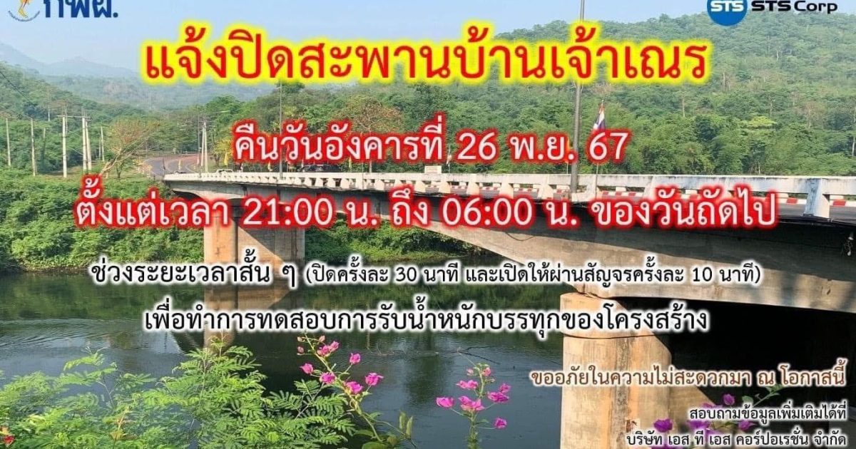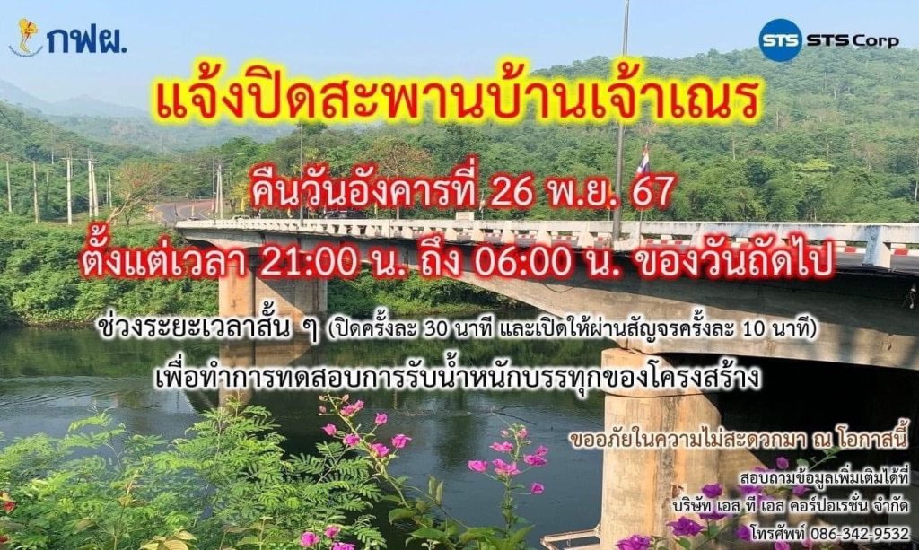 เนื่องด้วยเขื่อนศรีนครินทร์ จะดำเนินการสำรวจและทดสอบโครงสร้างสะพานบ้านเจ้าเณร ตั้งแต่วันที่ 15 พฤศจิกายน 2567 ถึงวันที่ 15 ธันวาคม 2567 และปิดเส้นทางสะพานบ้านเจ้าเณร เพื่อทดสอบการรับน้ำหนักของโครงสร้าง ในวันที่ 26 พฤศจิกายน 2567 ตั้งแต่เวลา 21.00 น. ถึงเวลา 06.00 น. ของวันถัดไป (ปิดครั้งละ 30 นาที และเปิดให้สัญจรครั้งละ 10 นาที)
