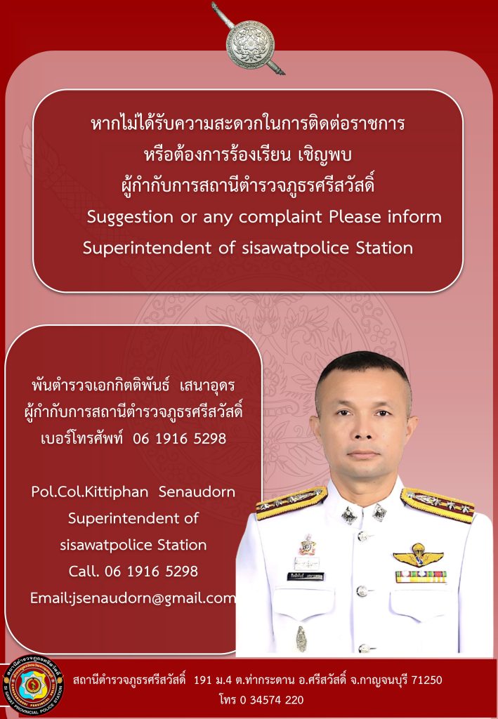 หากไม่ได้รับความสะดวกในการติดต่อราชการ หรือต้องการร้องเรียน เชิญพบ ผู้กำกับการสถานีตำรวจภูธรศรีสวัสดิ์