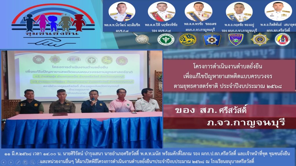 ร่วมพิธีเปิดโครงการตำบลยั่งยืน เพื่อแก้ไขปัญหายาเสพติดแบบครบวรจรตามยุทธศาสตร์ชาติ ตำรวจภูธรจังหวัดกาญจนบุรี ปีงบประมาณ พ.ศ.2568 โดยมี นายศิริรัตน์ บำรุงเสนา นายอำเภอศรีสวัสดิ์ เป็นประธานในพิธี ณ โรงเรียนอนุบาลศรีสวัสดิ์ ต.หนองเป็ด อ.ศรีสวัสดิ์ จว.กาญจนบุรี