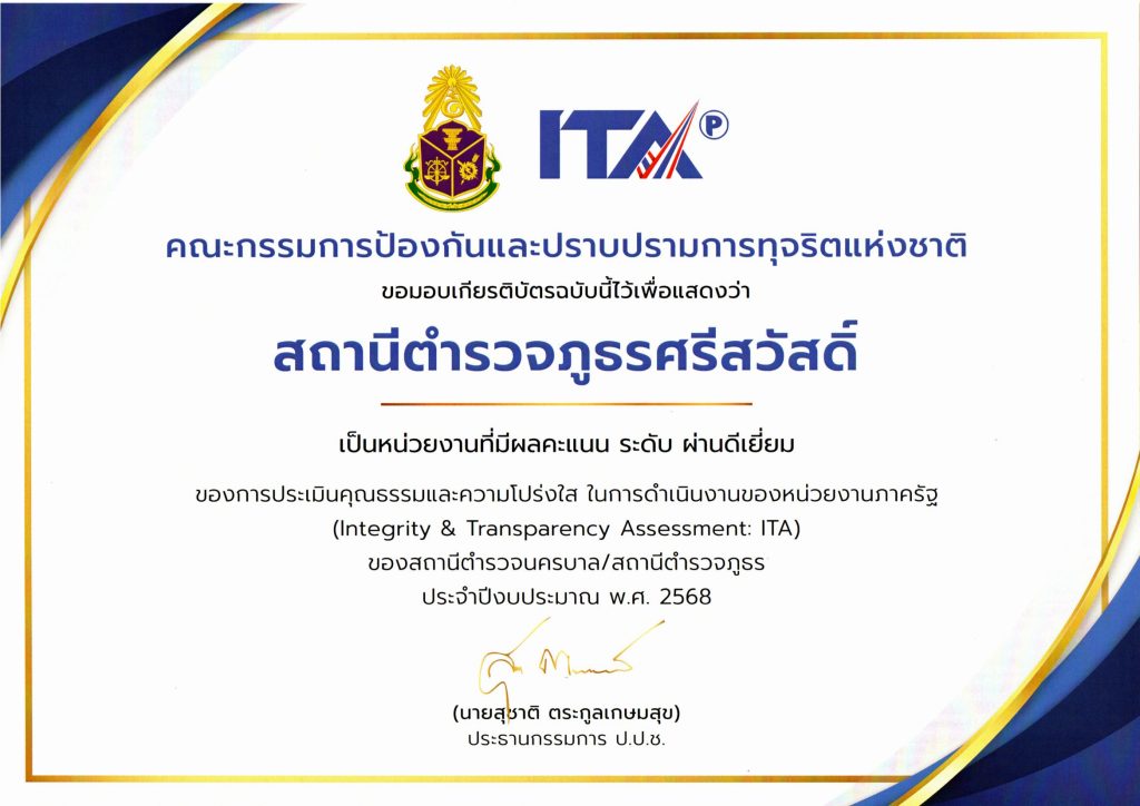 สถานีตำรวจภูธรศรีสวัสดิ์ ได้ใบประกาศผลการประเมินฯ ดังนี้