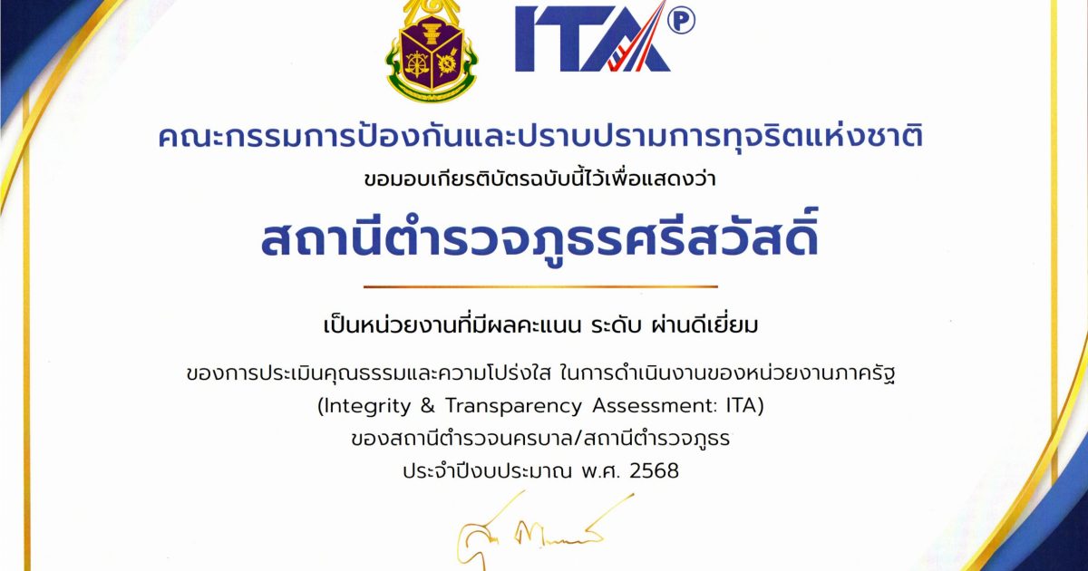 ผลการประเมินคุณธรรมและความโปร่งใสในการดำเนินงานของหน่วยงานภาครัฐ (ITA) ประจำปีงบประมาณ พ.ศ. 2568 ประกาศไปแล้วเมื่อ วันที่ 15 สิงหาคม 2568 โดยสำนักงาน ป.ป.ช. และสามารถดูรายละเอียดผลได้ที่เว็บไซต์ NACC ITA