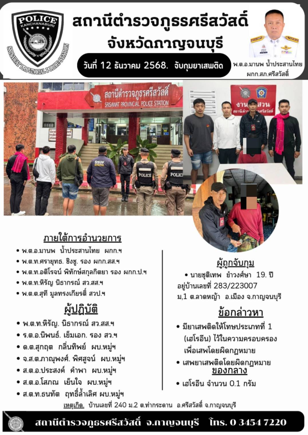 สภ.ศรีสวัสดิ์ เรียน ผู้บังคับบัญชาเพื่อโปรดทราบ วันที่ ๙ ธันวาคม ๒๕๖๘ เวลาประมาณ ๑๓.๒๐ น. ภายใต้การอ