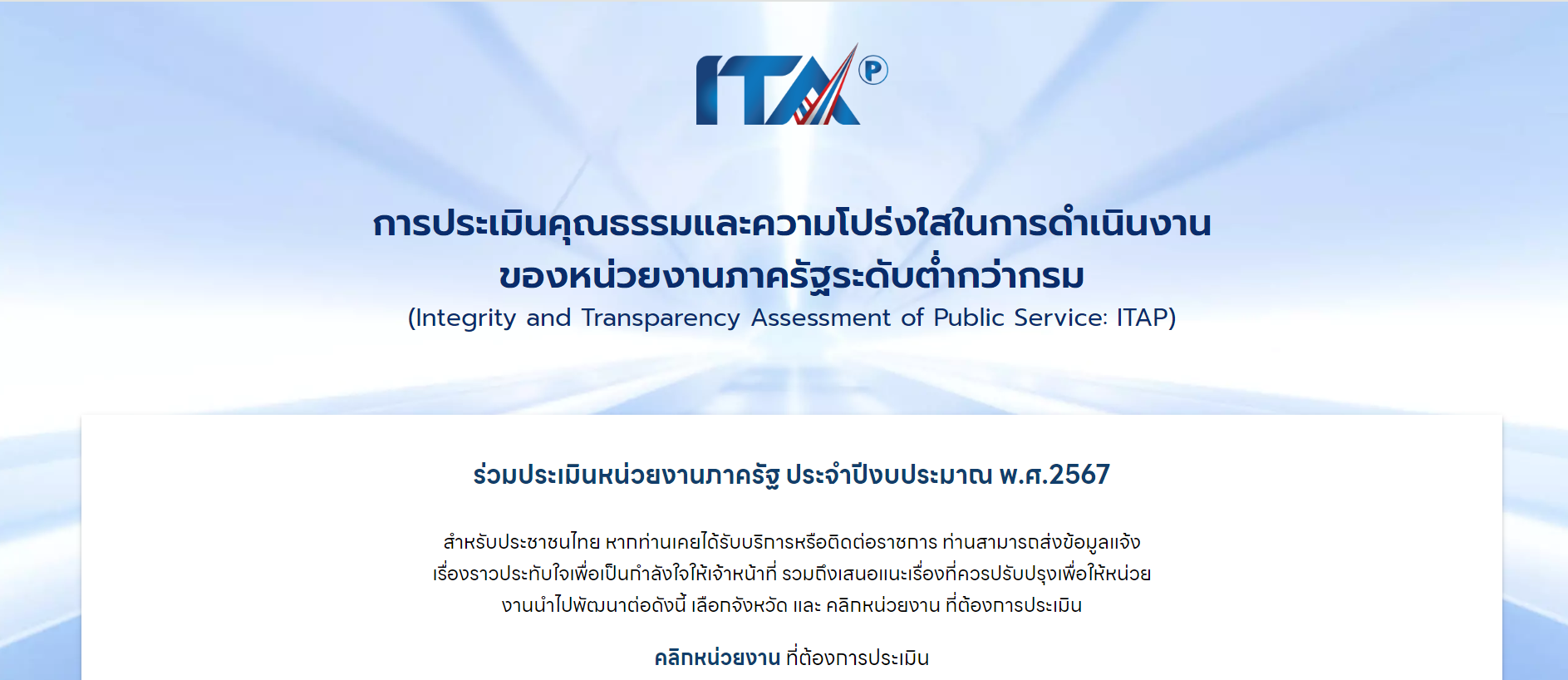 ขอเชิญผู้มารับบริการหรือมาติดต่อราชการร่วมประเมินคุณธรรมและความโปร่งใสในการดำเนินงานของหน่วยงานภาครั