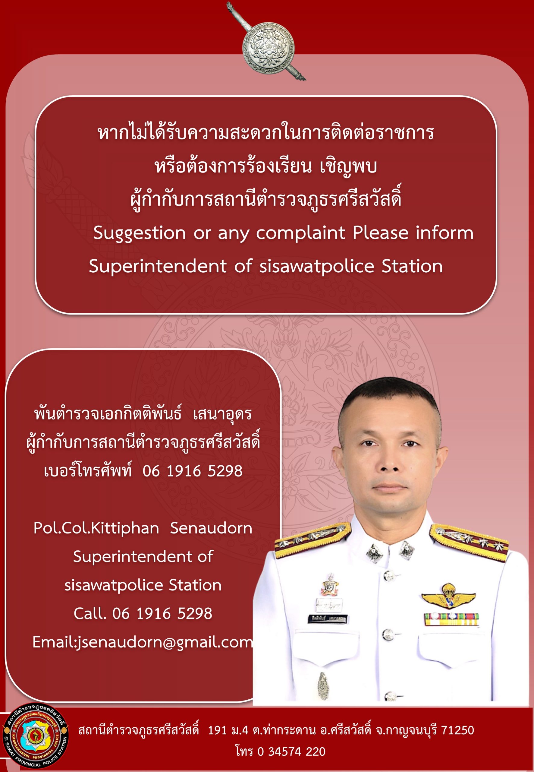 หากไม่ได้รับความสะดวกในการติดต่อราชการ หรือต้องการร้องเรียน เชิญพบ ผู้กำกับการสถานีตำรวจภูธรศรีสวัสด