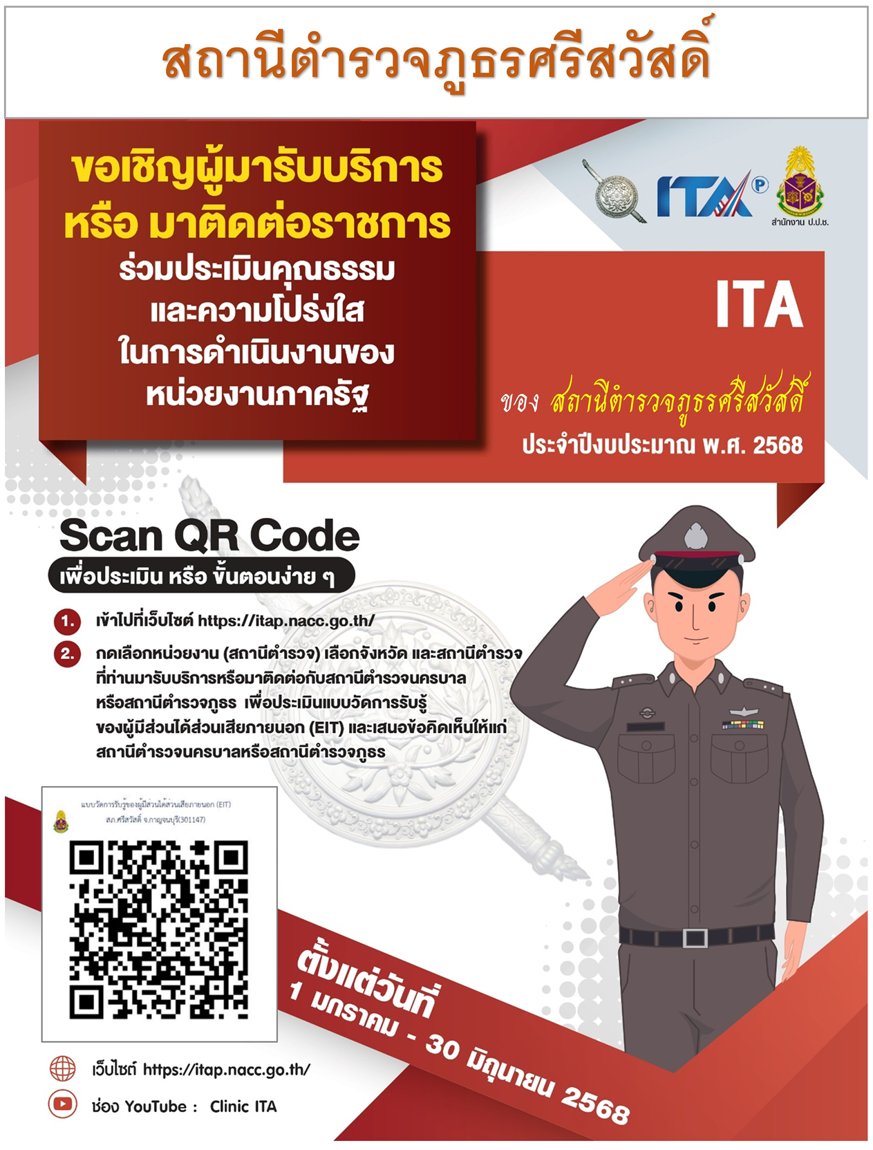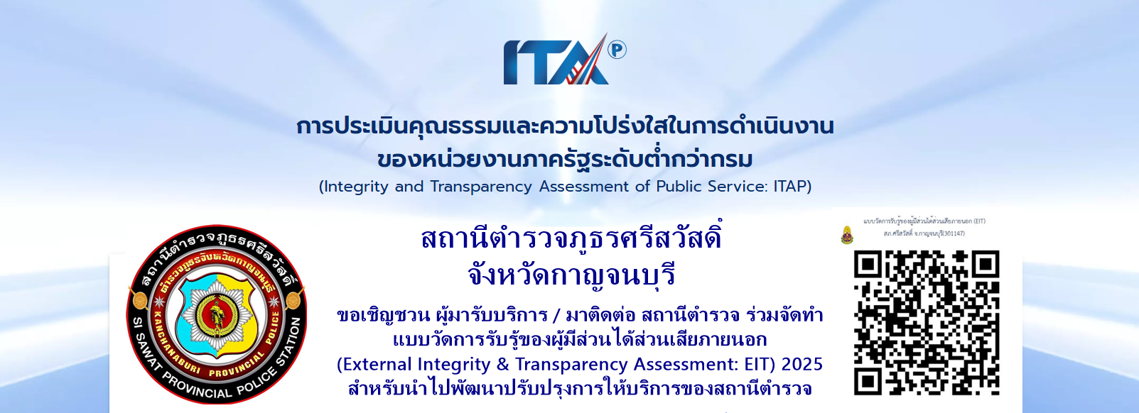 ขอเชิญผู้มารับบริการหรือมาติดต่อราชการร่วมประเมินคุณธรรมและความโปร่งใสในการดำเนินงานของหน่วยงานภาครัฐ ของสถานีตำรวจภูธรศรีสวัสดิ์ ประจำปีงบประมาณ พ.ศ. 2568