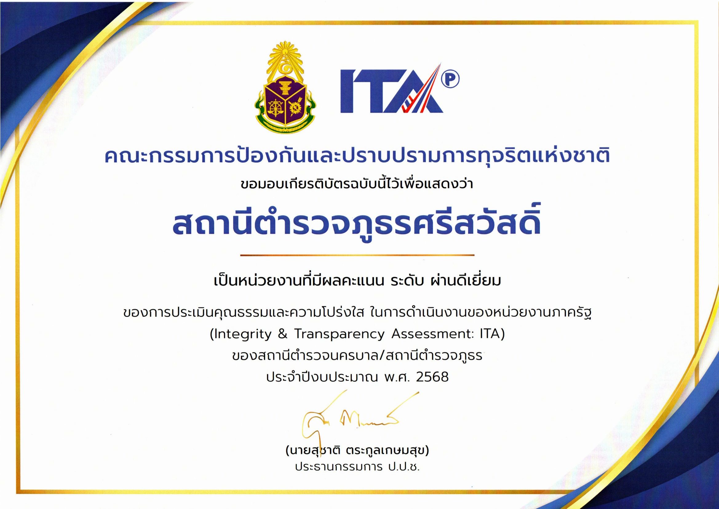 ใบประกาศผลการประเมินคุณธรรมและความโปร่งใสในการดำเนินงานของหน่วยงานภาครัฐ (ITA) ประจำปีงบประมาณ พ.ศ. 2568 ของสถานีตำรวจภูธรศรีสวัสดิ์