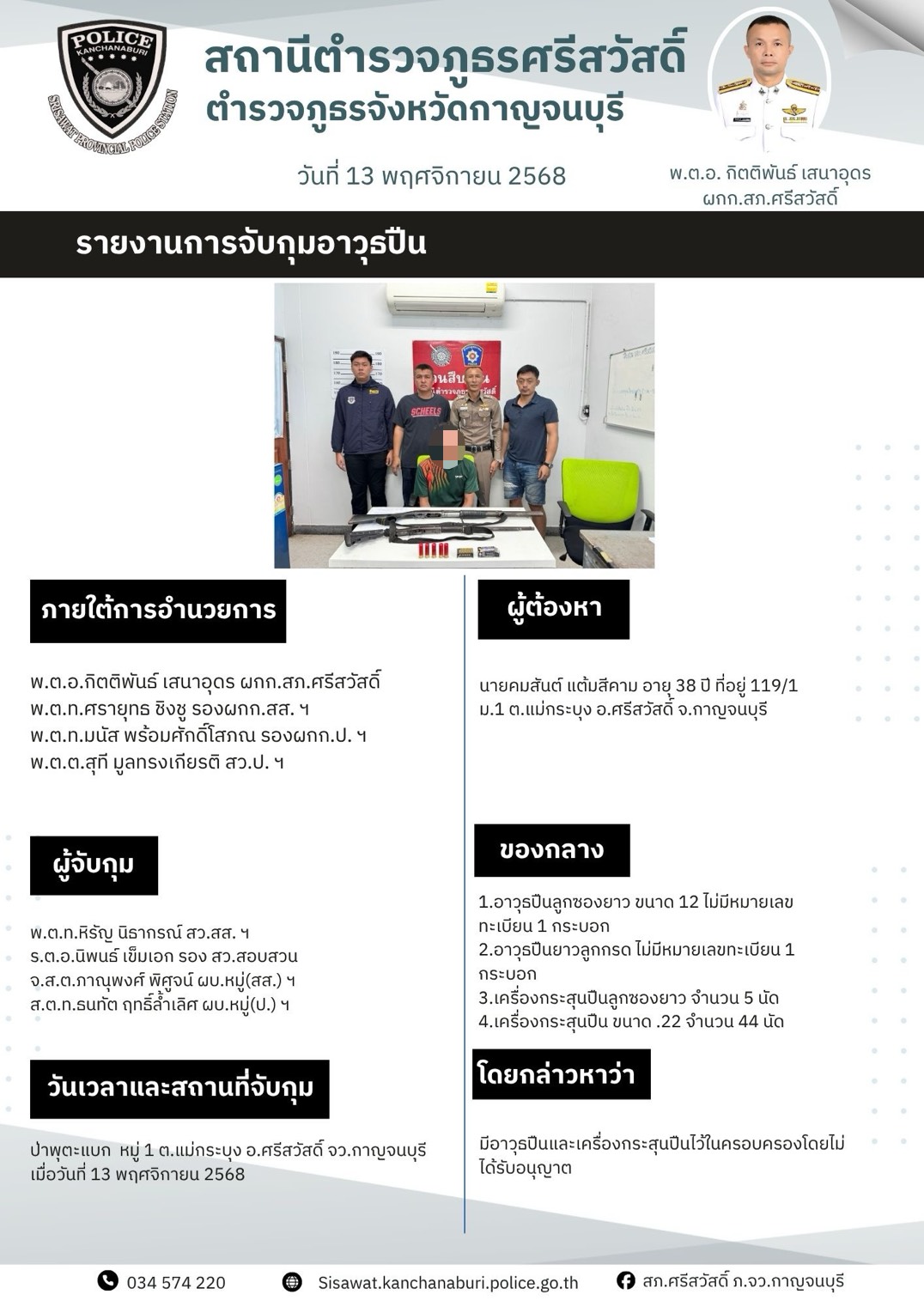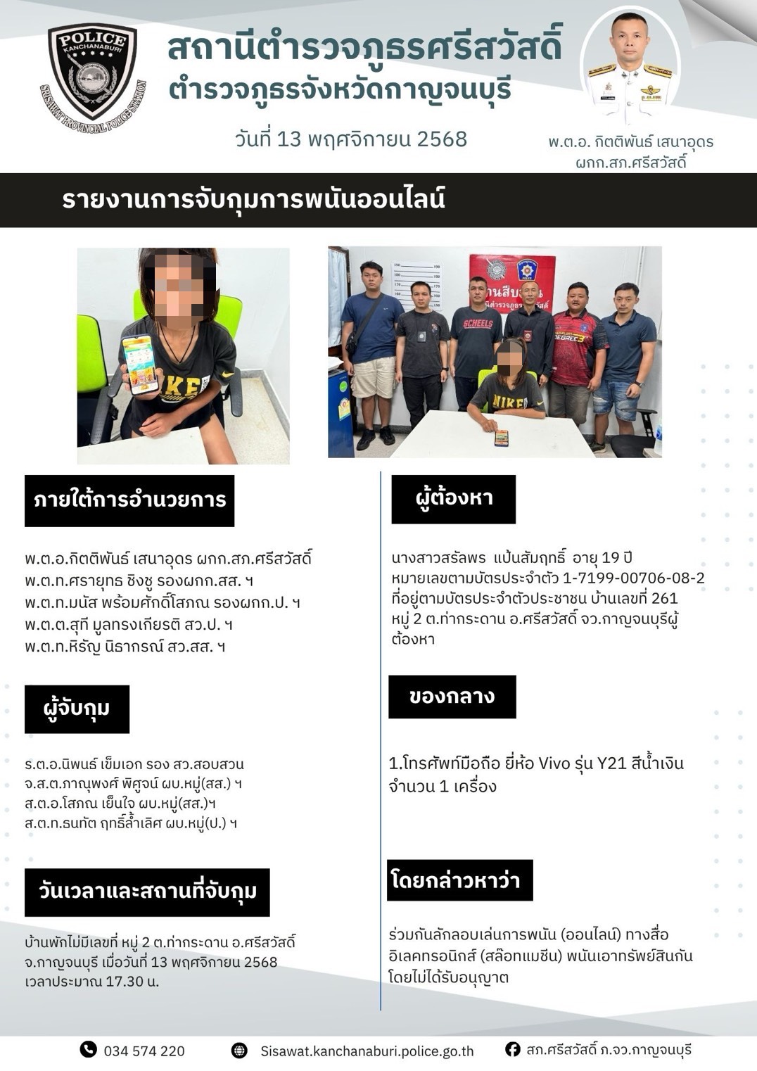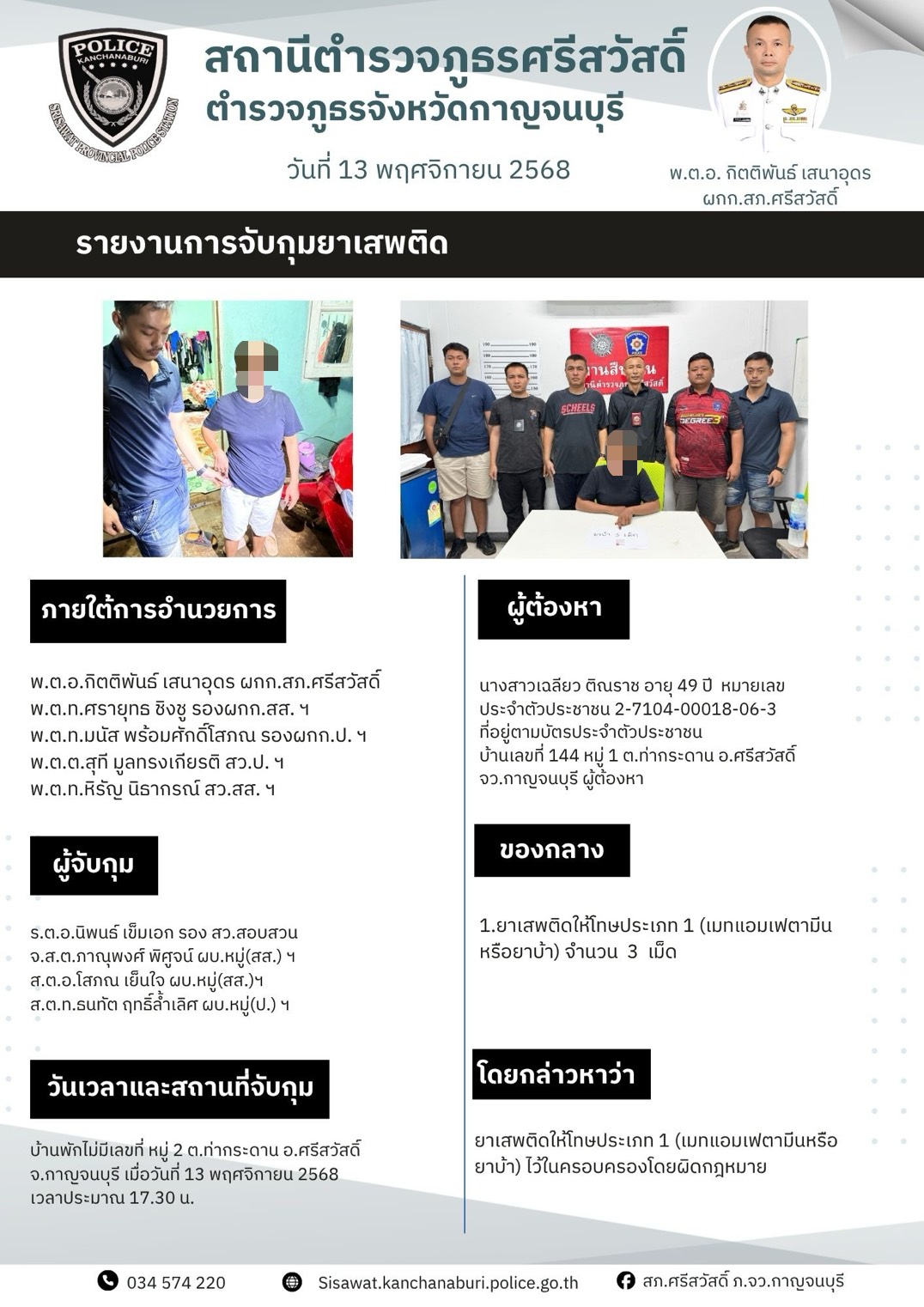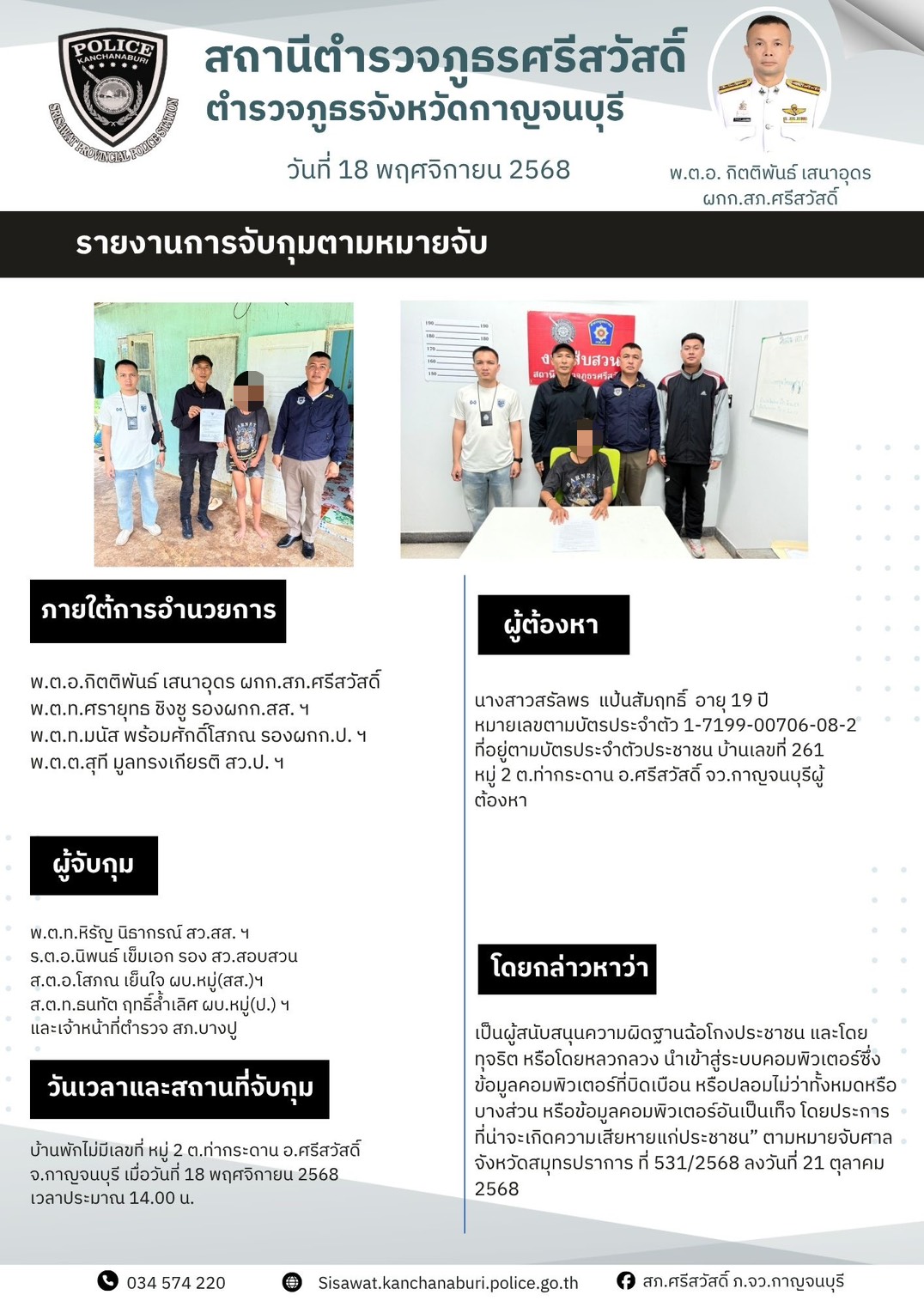 สภ.ศรีสวัสดิ์ ภ.จว.กาญจนบุรี 🔶เรียน ผู้บังคับบัญชา 📍วันนี้ 6 พ.ย.68 เวลา 10.30 น. 👮🏻♀️ พ.ต.อ.กิตติพ
